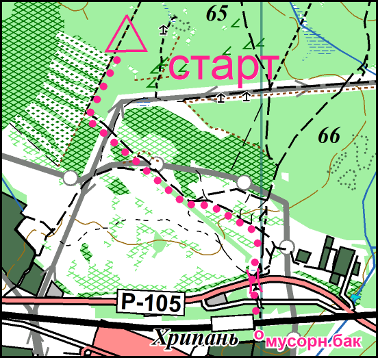 Старт ММБ-2021-осень находится в 1.7 км от пл. Хрипань Казанского направления. Выйти из первого вагона, перейти ж/д пути на северную сторону, далее по схеме. Старт находится в 100м к северо-востоку от восточного угла вырубки, на восточной стороне просеки, у тропы. Ориентир - берёзовое бревно из нескольких частей поперёк просеки.