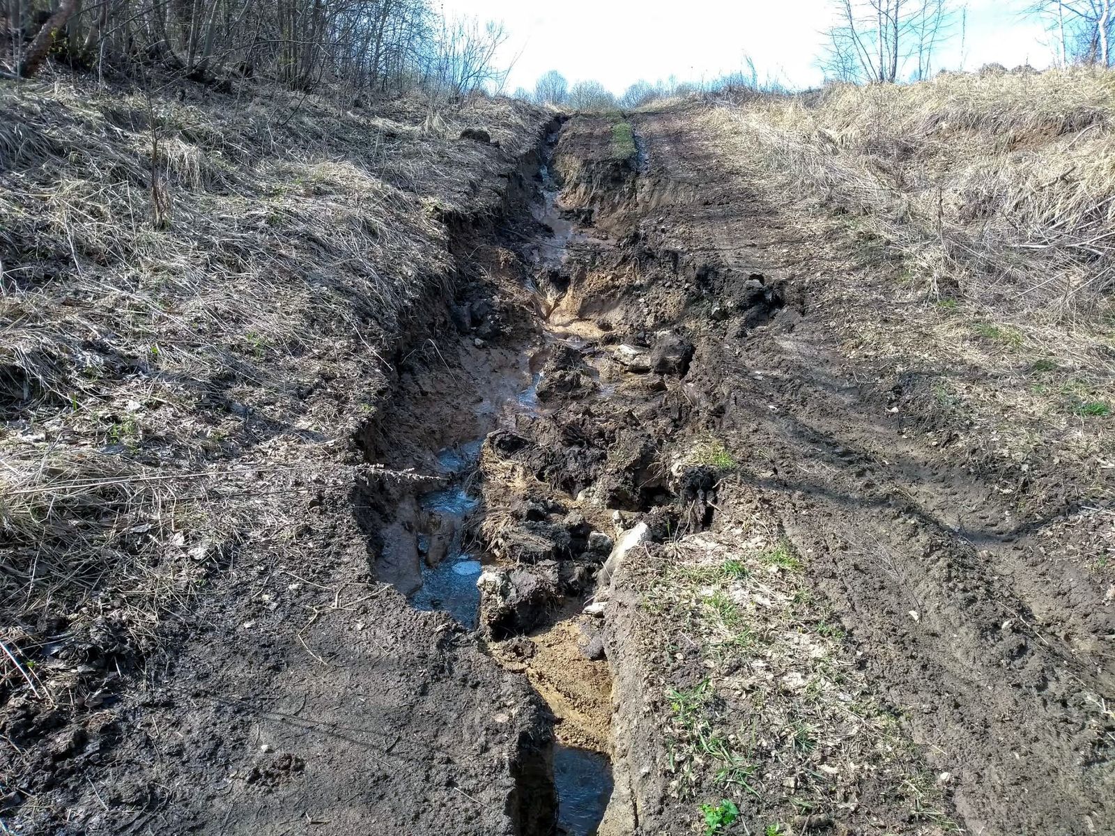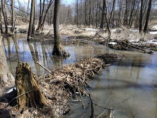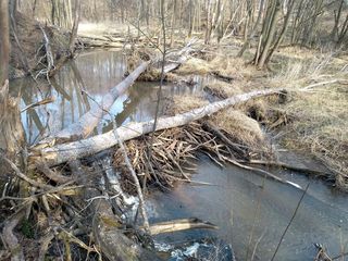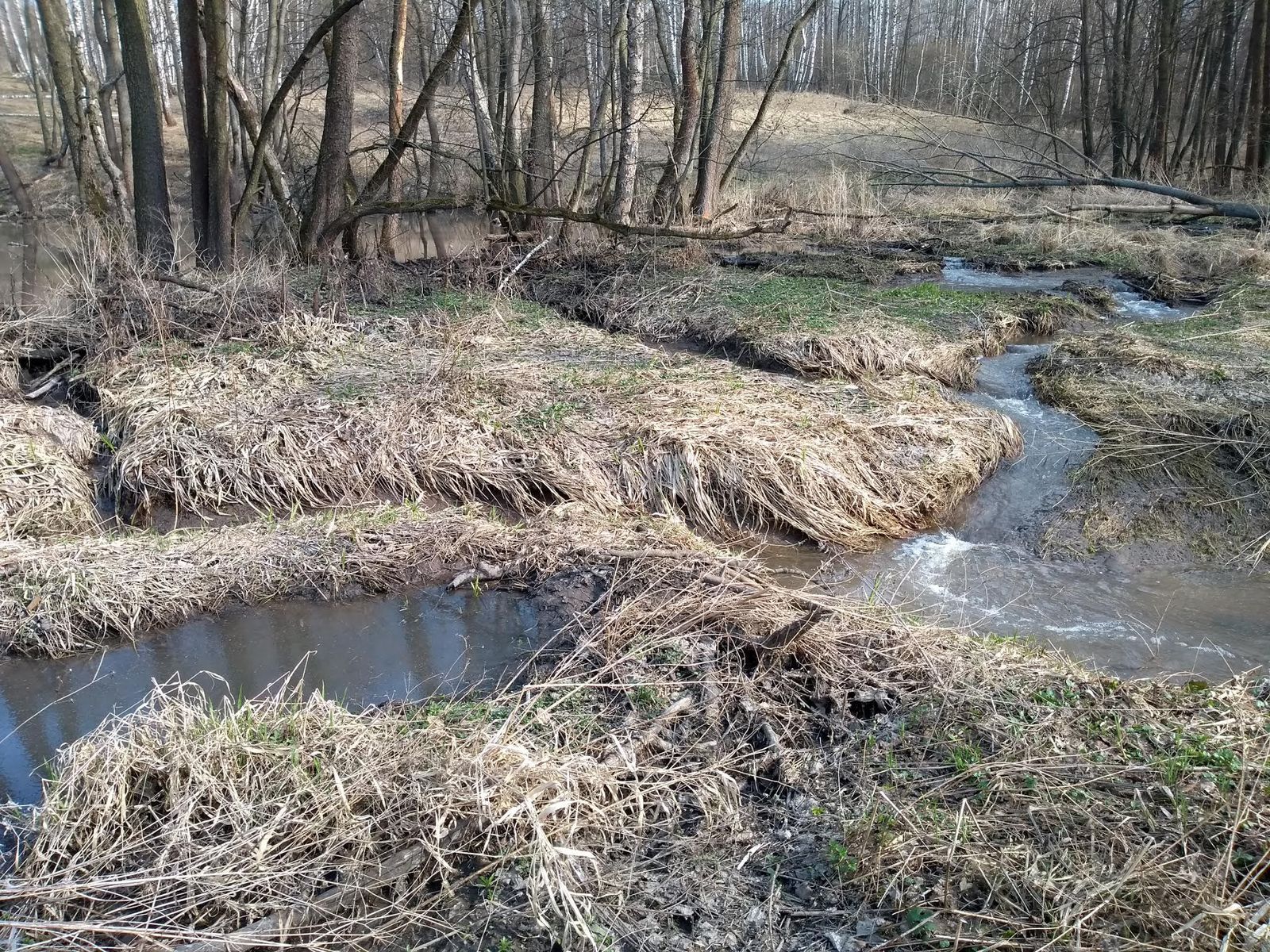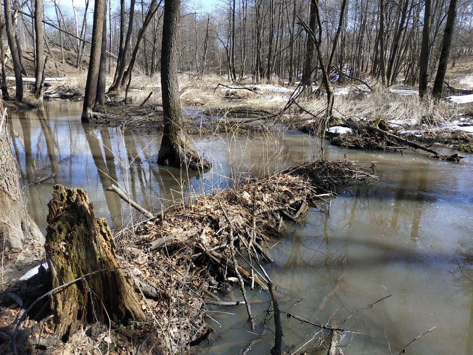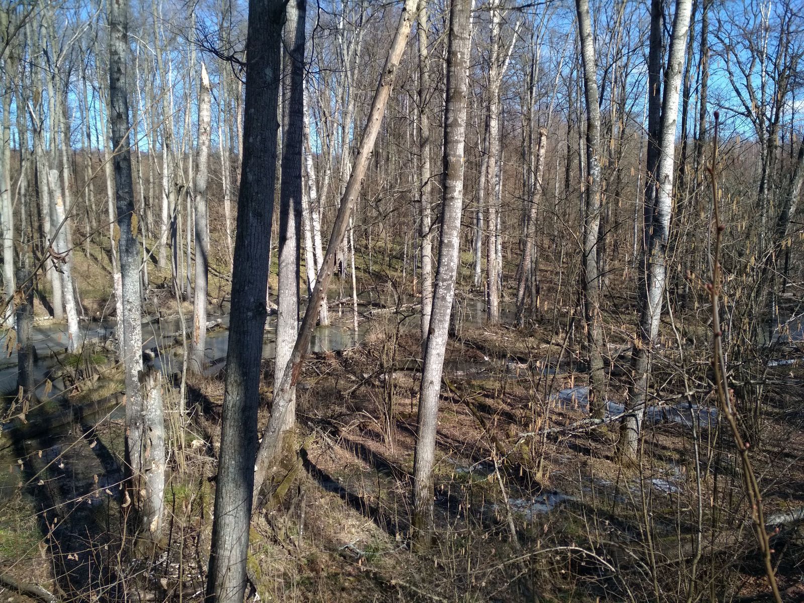 Сейчас, после нескольких снеговых и дождевых паводков, в районе очень много воды. Почти каждый овраг представляет собой ручей, а многие ручьи стали труднопредолимыми вброд (но брёвен для перехода хватает). Вода мутная, особенно там, где поработали бобры. Некоторые родники затоплены прилежащими ручьями. Мы не рекомендуем пить сырую воду – по возможности кипятите её.